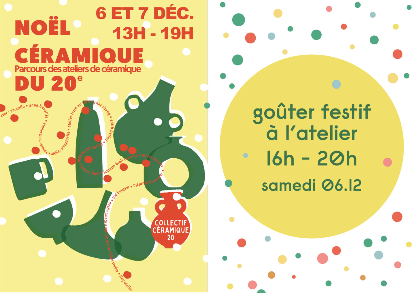L’atelier et ses vitrines en fête vous accueilleront le week-end du 6 et 7 décembre dans le cadre du parcours de Noël des ateliers de céramique du 20è. Nous trinquerons ensemble le samedi  6 de 15h à 20h autour d’un goûter très spécial pour nous car comme vous le savez, l’atelier fête cette année ses 10 ans!! Soyez les bienvenus pour partager notre traditionnel vin chaud accompagné d’un somptueux buffet de Noël !